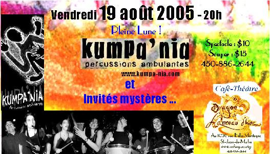 Impossible de rester immobile lorsque l'air s'emplit de la joyeuse musique de KUMPA'NIA! 20 percussionnistes débridés envahissent la scène pour offrir leurs rythmes festifs et dansants dans une ambiance toujours conviviale.